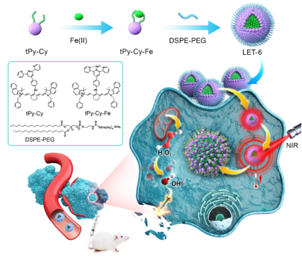 该团队首先合成了有机吡啶配体修饰花菁类分子(tPy-Cy),然后利用吡啶与Fe2+强的配位作用,从而保持其离子价态,避免其氧化。再利用纳米沉淀法,将螯合Fe2+的tPy-Cy与DSPE-PEG制备成粒径均一的纳米颗粒(LET-6)。在808 nm激光照射下,光热作用导致LET-6变形并解体,释放Fe2+,从而触发CDT。该Fe2+递送系统在细胞水平和动物水平,均展现出优异的治疗效果。在动物水平,仅一次治疗,荷瘤小鼠的肿瘤完全消除。这种光刺激响应的可变形Fe2+递送系统在肿瘤诊疗中具有潜在临床应用前景。
