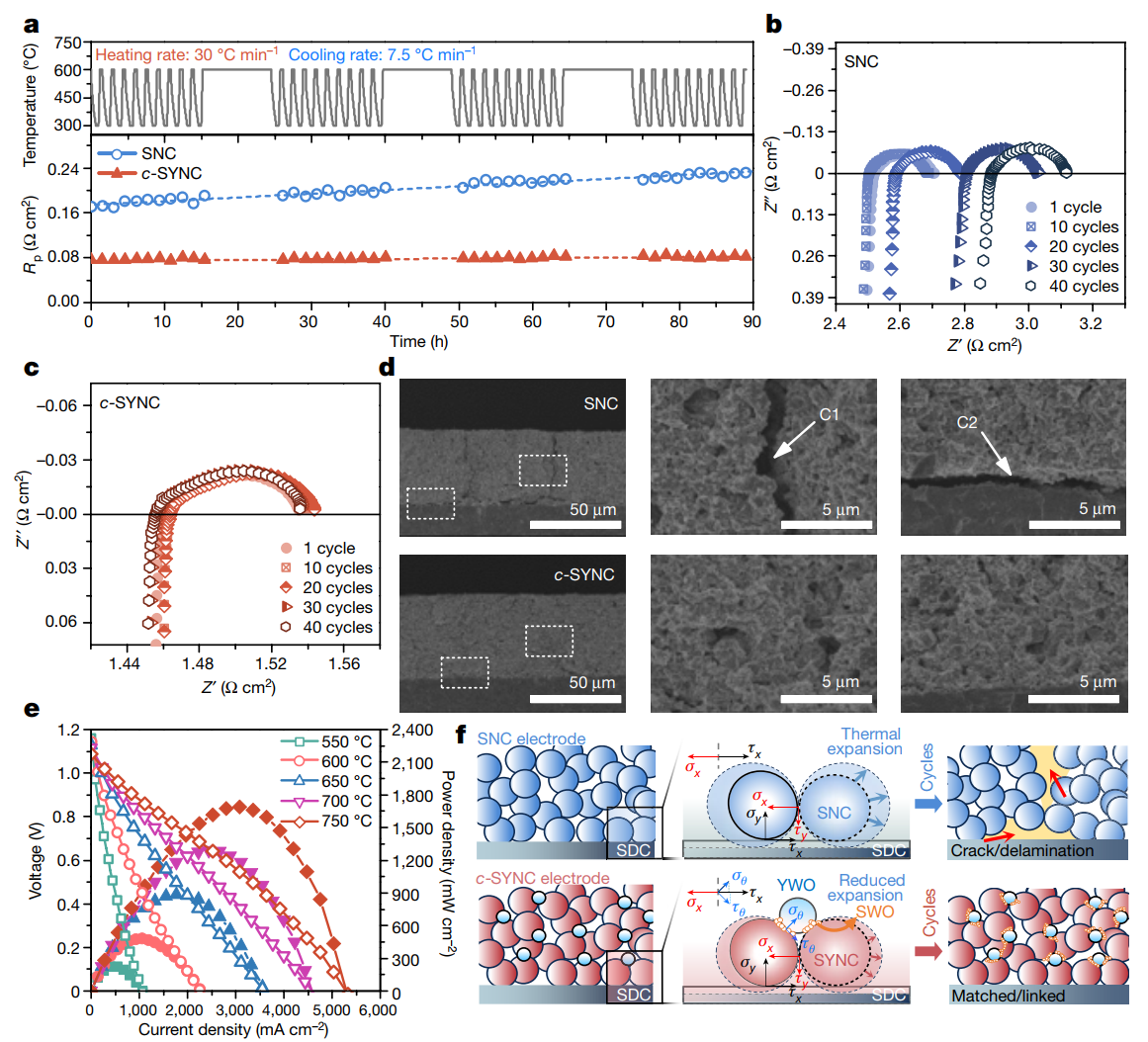 该研究首次提出“负热膨胀补偿调节”概念,建立了负膨胀材料-钙钛矿界面机械锚固力学平衡效应模型,分析了负膨胀材料与钙钛矿材料原位反应界面锚固效应强化机理,并有效复合负膨胀材料与钙钛矿材料,成功降低复合材料电极的热膨胀系数,优化电极-电解质材料界面,克服了固体氧化物电池电极-电解质界面热膨胀系数不匹配的难题。研究发现,电极热膨胀系数的降低、钙钛矿相结构优化和热机械稳定性提升的协同作用共同促进了这种复合电极的出色电化学性能,该成果为团队正在攻关的“零碳排放直接煤固体氧化物燃料电池”新型高性能电极材料的开发提供了坚实的技术支持与保障。