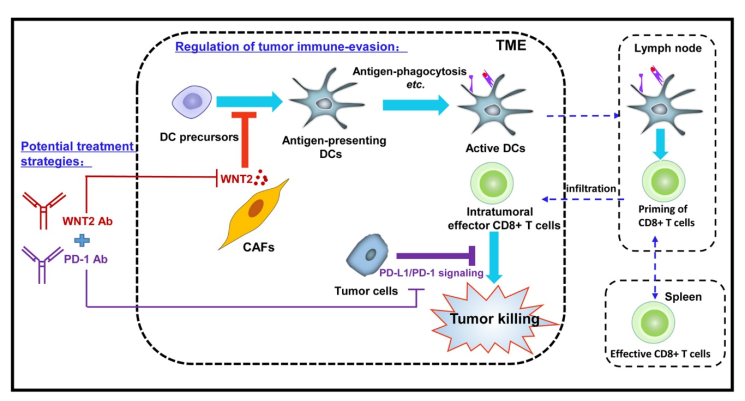 CAFs分泌的WNT2可以抑制DC细胞的分化,减少效应T细胞的产生,进而减弱肿瘤内的T细胞杀伤效应;WNT2抗体联合PD-1抗体治疗,可以从不同阶段正常化肿瘤内的抗肿瘤免疫反应。