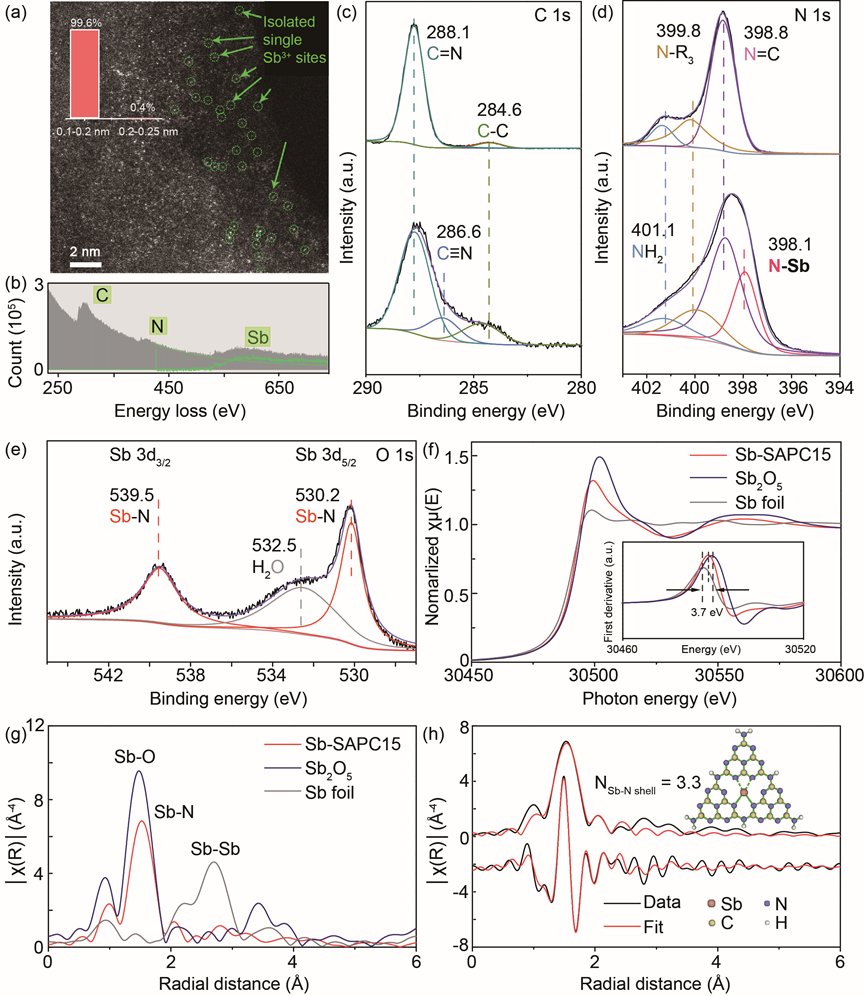 Sb-SAPC15的高分辨扫描透射高角度环形暗场像中亮点的大小部分均小于0.2 nm。Sb-SAPC15的电子损失谱说明该区域由C, N, Sb构成,也表明Sb元素存在于PCN的结构中 (图 4a-b)。 图4c-e, PCN的高分辨率C 1s(c)和N 1s 光电子能谱光谱(d)和Sb-SAPC15的Sb 3d XPS光谱说明,Sb可能与N原子成键,且化合价接近+3 (图4c-e)。Sb箔, Sb2O5和Sb-SAPC15的Sb-K边 X射线近边吸收谱和精细结构谱表明XANES和傅立叶变换扩展X射线吸收精细结构(FT-EXAFS)光谱(图4 f-h)进一步说明了Sb的价态接近+3。从DFT优化获得的模型拟合Sb-SAPC15的EXAFS数据说明,Sb与周围N原子的平均配位数为3.3。