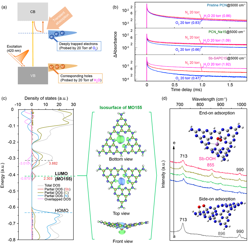 作者进一步用不同气氛下的瞬态吸收谱作为OER / ORR的探针(图5a-b)。在N2, O2和H2O气氛(20 Torr)下, 5000 cm-1波长的脉冲光激发下PCN, PCN_Na15和Sb-SAPC15之间的瞬态吸收衰减的比较说明,Sb-SAPC15所生成的电子和空穴可以分别高效地与氧气和水反应。Melem_3Sb3+的总态密度(TDOS), 分状态密度(PDOS)和状态重叠密度(ODOS)与LUMO等值面(Isovalue为0.05) 表明,电子在光激发的时候主要被累积到Sb原子上,利于氧还原反应(图5c)。通过原位拉曼光谱的数据表明(图5d), O2分子在孤立的Sb原子位点的吸附是端对端吸附(end-on), 这选择性促进了Sb-μ-过氧化物(Sb-OOH)的形成,避免了以往利用氮化碳材料在melem位点处形成的侧面(side-on)吸附态, 从而减少了氧氧键的断裂,为H2O2的生产提供了高选择性的2e- ORR途径。