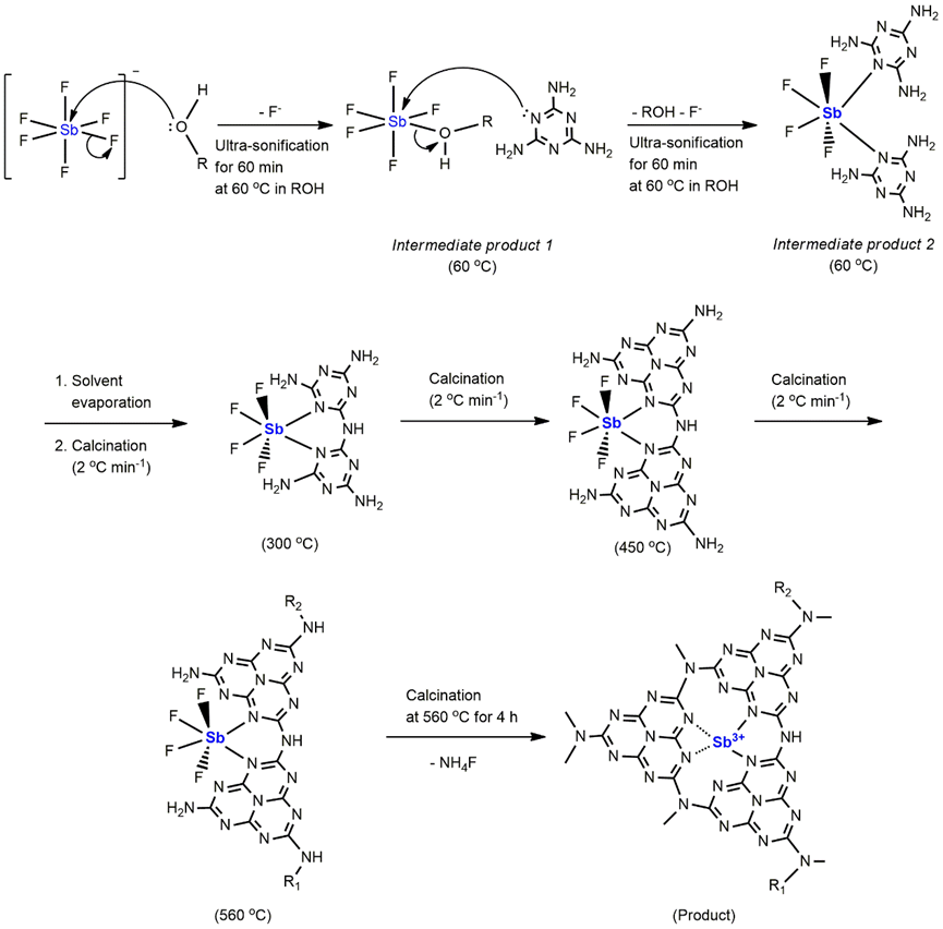 Sb-SAPC由自下而上的方法制备:一定量的NaSbF6(0.5 mmol,1 mmol,3 mmol,5 mmol,10 mmol,15 mmol和20 mmol将其在60°C超声处理下溶于30 mL乙醇60分钟,然后加入4 g三聚氰胺通过旋转蒸发仪和真空烘箱的组合除去溶液中的溶剂。将得到的白色粉末转移到管式炉中。在N2气氛中以2°C min-1的升温速率将炉温从25°C升高至560°C,然后在560°C保持4 h。热处理后,在连续不断的N2流动下,将炉自然冷却至25°C (图2)。