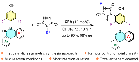 该项研究以B-aryl-1,2-azaborines与diazodicarboxamides为反应底物,手性磷酸作为催化剂,通过远程的去对称化策略,成功实现了手性C-B轴手性化合物的不对称构建。该工作重点聚焦:1)如何实现具有更长分子间距的C-B轴手性的不对称构建;2)探究催化剂与底物作用机理以及反应高效的原因。