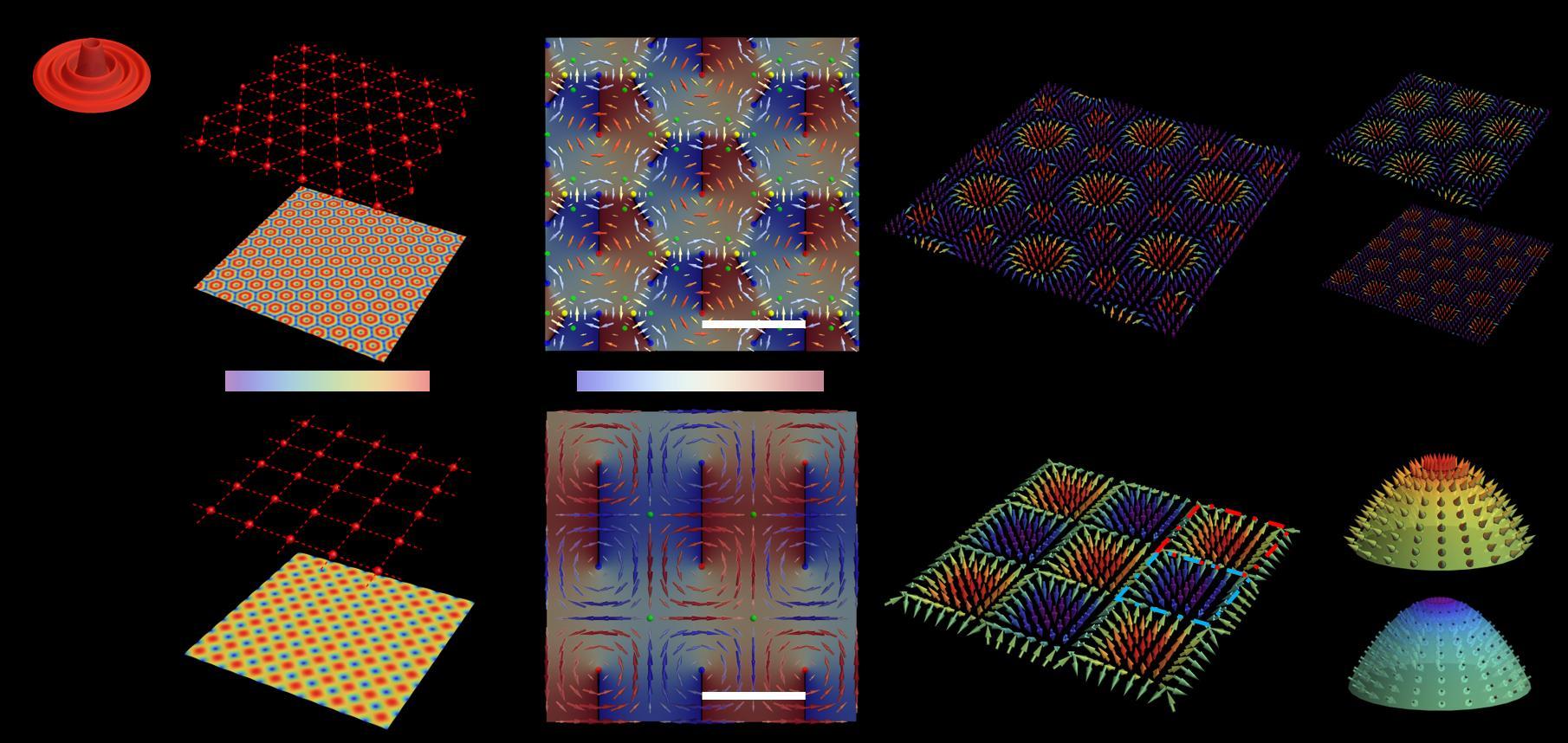 在凝聚态体系中,晶体各向异性能和相邻自旋磁矩的耦合作用决定了不同磁畴结构的形成,如磁性斯格明子(skyrmion)、半子(meron)等,而光学自旋拓扑的形成机理尚未得到有效的论证。该研究表明,由于旋转对称性破缺,六角及四角对称下的近场自旋-轨道耦合将分别形成Abrikosov及Staggered型的能流涡旋分布。根据广义的自旋-动量绑定,两种能流结构分别对应光学自旋skyrmion及meron阵列(图1)。同时,通过求解方形边界下能量哈密顿量的极值,可以得到与理论预测一直的自旋meron结构。该研究揭示了自旋拓扑光子学新物理,为光学体系下的自旋拓扑特性的研究提供了新思路,在光学位移传感、磁畴检测、量子技术等领域具有重大的应用前景。