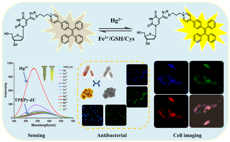 摘要图:有机合成的多功能核苷-AIE探针:Hg2+和Fe3+/GSH/Cys的可逆响应、生物成像和抗菌。