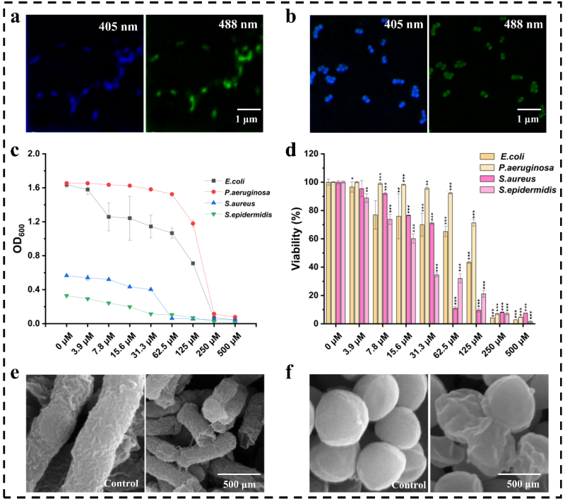 图:(a).大肠杆菌和(b).金黄色葡萄球菌分别在405和488nm激光激发下与TPEPy-dU孵育10分钟后的CLSM图; (c).不同浓度的TPEPy-dU对大肠杆菌、铜绿假单胞菌、金黄色葡萄球菌和表皮葡萄球菌生长的抑制作用与培养时间的关系; (d).细菌细胞活力评估处理18小时。注:与对照组相比,ns无显著差异,**P<0.01,***P<0.001, ##P<0.01; (e).大肠杆菌和(f).金黄色葡萄球菌的SEM图;注:左图---没有处理的空白;右图---用TPEPy-dU处理4小时)。