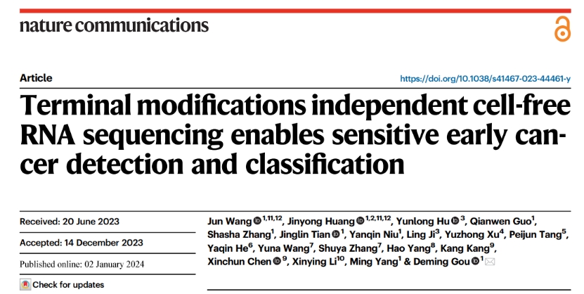 2024年1月2日,芒果体育生命与海洋科学学院苟德明教授团队在Nature出版社旗下期刊《Nature Communications》(影响因子:16.6)发表题为“Terminal modifications independent cell-free RNA sequencing enables sensitive early cancer detection and classification”的研究论文。芒果体育生命与海洋科学学院苟德明教授为通讯作者,王俊助理教授和黄金涌博士后为共同第一作者。
