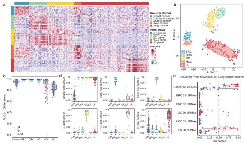 为评估SLiPiR-seq在多癌种分类的可行性,研究团队利用该技术额外对30例乳腺癌,37例结直肠癌,55例胃癌,15例肝癌进行了血浆cfRNA检测。通过机器学习分析,研究团队建立了一个通用的癌症检测模型和肺癌、乳腺癌、结直肠癌、肝癌、胃癌五种癌症特异的诊断分类模型,证明了cfRNA的差异表达谱在癌症诊断和分类中具有强大的性能。因此,血浆cfRNA可以作为癌症的生物标志物应用于临床。