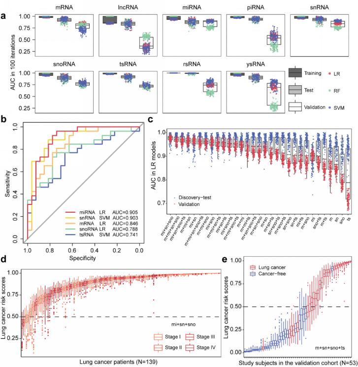 为了评估SLiPiR-seq 技术在肺癌检测中的应用效果,该研究对139 名肺癌患者和 106 名无癌症个体的发现队列进行了回顾性分析。基于 cfRNA 计数的负二项分布模型在病例和对照之间确定了12840个差异表达的 cfRNA(padj<0.1)。将上述队列随机分成 80%作为训练集,用来训练机器学习诊断模型,将 20%作为测试集,用来评估模型的区分效果。本研究采用了逻辑回归、随机森林、支持向量机三种机器学习算法来系统地评估九类RNA的肺癌诊断效果。为了避免偏差,所有模型的随机取样和训练-测试过程均重复进行了 100 次。九类RNA所训练的模型在测试集中均取得了较好的分类效果。为了进一步评估诊断模型在检测早期肺癌方面的效果,对来自另外两个临床中心的独立验证队列进行分析,该队列包括26 名 I 期肺癌患者和27 名健康人。惊喜的是,mRNA(AUC=0.846)、miRNA(AUC=0.905)、snoRNA(AUC=0.788)、snRNA (AUC=0.903)和tsRNA(AUC=0.741)五类RNA所训练的模型可以精准区分I 期肺癌患者和健康人。将这五类RNA组合来训练模型,发现由“mi+sn+sno”组成的模型具有最佳的早期肺癌检测效果(AUC=0.979;发现队列中灵敏性96.40%,特异性97.81%;独立验证队列中灵敏性100%,特异性78.79%)。在大规模早期筛查中,为了避免假阳性,高特异性往往比高灵敏性更重要。因此,该研究指出由“m+sn+sno+ts”组合训练的模型具有更高的特异性(发现队列中灵敏性99.28%,特异性100%;独立验证队列中灵敏性76.92%,特异性95.24%),更加适合肺癌早筛的情景。