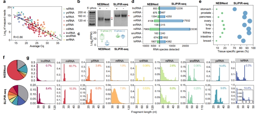 芒果体育苟德明教授团队长期致力于展非编码RNA 在肺部疾病的发病机制和临床转化研究,发明了Direct S-Poly(T)Plus等基于荧光定量PCR的小分子RNA定量检测技术。为了满足高通量的需求,该团队对此前技术进行优化,开发了灵敏的血浆cfRNA文库制备技术(SLiPiR-seq),该技术具有不依赖RNA末端修饰的优势,因此即使只用微量血浆(至少100微升)也依然能得到准确可靠的检测结果。SLiPiR-seq对RNA的定量结果与金标准荧光定量PCR技术具有很高的相关性。对比传统的接头连接文库制备方法,SLiPiR-seq可以在血浆中检测到更多种不同类型的RNA,其中, mRNA和长非编码RNA(lncRNA)的检出量大大增加。由于可以更多的检出与基因表达和调控相关的RNA种类,SLiPiR-seq技术在揭示血浆转录本与病理机制的关联等研究中具有很好的前景。