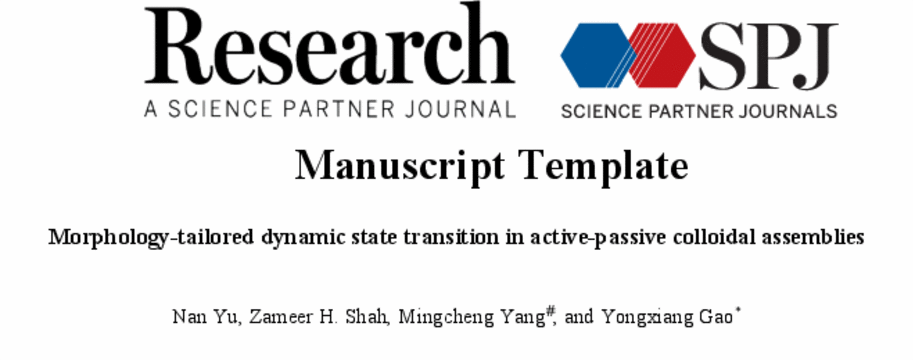 2024年1月3日,高永祥团队与中科院物理所杨明成研究员合作,在Research发表了题为 “Morphology-tailored dynamic state transition in active-passive colloidal assemblies”的研究论文。俞楠博士为论文的第一作者,高永祥研究员为论文的共同通讯作者,芒果体育为第一单位。
