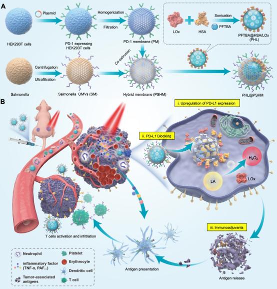 尽管免疫检查点阻断疗法(ICB)具有巨大的临床优势,但它仍然存在一些缺点,如反应率低、脱靶毒性和成本高昂。为了提高ICB的治疗效果,并降低其治疗成本,该团队设计并制备了一种由真核生物基因工程改造细胞膜与原核生物外膜囊泡组成的融合膜PSHM,其中真核生物膜来自于高表达PD-1蛋白的人肾上皮HEK293T细胞(PM),原核生物膜来自减毒的厌氧菌沙门氏菌OMVs(SM)。该融合膜修饰的乳酸氧化酶-全氟三丁胺纳米乳(PHL@PSHM)可以同时上调肿瘤细胞的PD-L1表达,提高PD-L1阻断治疗的反应率;并靶向缺氧的肿瘤部位,实现由PD-1蛋白介导的高效PD-L1抑制;还可诱导红细胞外渗到肿瘤中,在不损伤周围组织的情况下对肿瘤进行光热消融,从而引起免疫原性细胞死亡,改善免疫抑制性的肿瘤微环境,提高ICB治疗效果。这种光热治疗是基于肿瘤组织自身浸润的血红蛋白等吸光物质,具有极高的组织特异性。上述三管齐下的光热-免疫协同疗法,在三阴性乳腺癌和结肠癌皮下移植瘤模型中均实现了对原位皮下瘤和远端转移瘤的高效抑制,显著延长了小鼠的存活期。