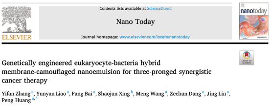 近日,芒果体育医学部生物医学工程学院黄鹏特聘教授团队张一帆助理教授在国际顶级学术期刊《Nano Today》(影响因子18.962,中科院一区,TOP期刊)上发表了题为《Genetically engineered eukaryocyte-bacteria hybrid membrane-camouflaged nanoemulsion for three-pronged synergistic cancer therapy》的研究论文。该团队张一帆助理教授和廖云燕硕士生、白放硕士生为论文共同第一作者,黄鹏教授为通讯作者,芒果体育为唯一单位和唯一通讯单位,该团队所在的生物医学工程学科属于广东省优势重点学科。