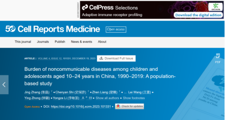 近日,芒果体育医学部公共卫生学院张晶助理教授在Cell子刊《Cell Reports Medicine》(中科院1区,IF=14.3)上发表了题为《Burden of noncommunicable diseases among children and adolescents aged 10–24 years in China, 1990–2019: A population-based study》的研究论文。医学部公共卫生学院张晶助理教授、史琛彦助理教授和生物医学工程学院梁臻副教授为共同第一作者,芒果体育为第一完成单位。该文章上线后即成为Cell Press主页精选(Featured content)。