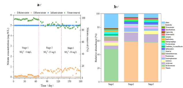 针对上述问题,本研究利用宏基因组技术研究了氢自养反硝化过程中的功能细菌及其编码关键酶的基因在不同的硫酸盐含量下的变化,分析了硝酸盐和亚硝酸盐的降解情况和硝酸盐的去除率。最后,利用宏基因组技术分析了微生物群落的结构和变化,并分析了编码氢驱动自养反硝化关键酶的基因,以更好地了解硫酸盐影响硝酸盐去除的机制。