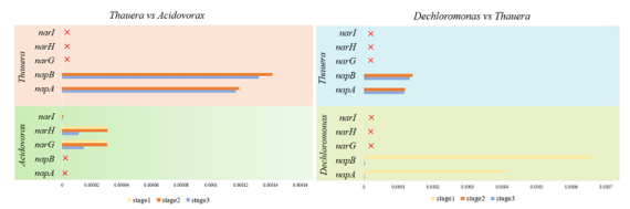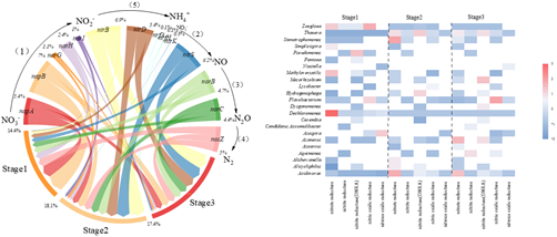 这些结果表明:硝酸盐作为唯一的电子受体,基本上被100%去除。但SO42-导致硝酸盐去除率降低到90% 以下。硫酸盐负载取代了Dechloromonas(第一阶段)和Thauera(第二和第三阶段)作为优势属,而它们都包含编码反硝化酶的所有功能基因。此外,Acidovorax 也是优势属(第2阶段和第3阶段),但它的丰度远不如Thauera。编码硝酸盐还原酶的基因在所有阶段都是最丰富的,但随着SO42-的增加而减少。其中,napB在SO42-环境下占硝酸还原酶功能基因的最大比例。相比 napA 基因,功能细菌Dechloromonas 和 Thauera具有更多的 napB 基因。因此,硫酸盐抑制了自养反硝化作用,特别是抑制了Dechloromonas及其功能基因napB。本研究为更好地了解硫酸盐对反硝化过程的影响,特别是关键微生物功能基因对硝酸盐去除具有重要意义。