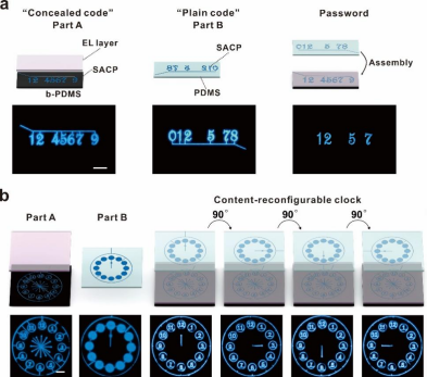 此外,这种器件可重构的特性为可视化的加密系统提供了新的思路。为了验证这个概念,研究团队展示了两种类型的器件:第一类将器件的A部分和B部分分别做在不透明和透明的基底上,构成“明码”和“暗码”(图3a),只有将正确的A部分和B部分组合,才能显示出所需的密码;第二类器件是时钟结构的加密器件,将B部分在A部分上方旋转不同角度时,显示的图案会指向不同的数字。