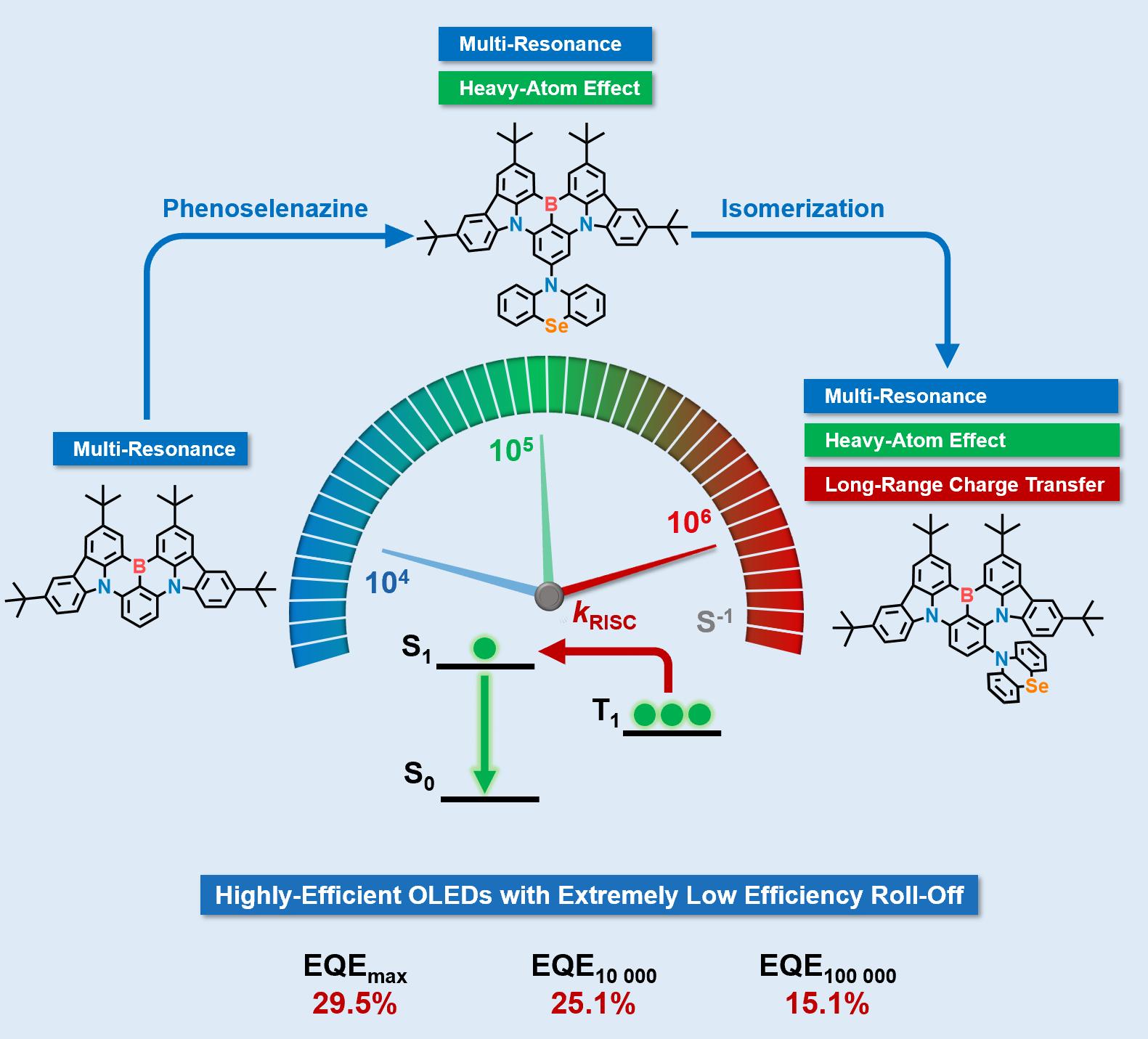 前沿OLED应用场景,诸如虚拟现实、透明显示需要在高亮度(超过10,000尼特)下工作,这对高亮度水平下的电致发光器件外量子效率(EQE)提出了高要求,甚至超越了最大外量子效率本身的重要性。为了在高亮度下实现高效的电致发光,发光材料需要兼具高激子利用率和短激子寿命。近年来,多重共振(multi-resonance, MR)热活化延迟荧光(thermally activated delayed fluorescence, TADF)分子因其兼具窄谱带发射和高光致发光量子效率(PLQY),成为未来高清显示OLED中极具前景的发光材料。TADF发光材料的反向隙间窜跃速率(kRISC)对于实现具有低效率衰减的高性能OLED至关重要,然而,MR-TADF发光材料固有的、原子定域化的分子前线轨道分布特性通常导致其反向隙间窜跃过程较慢,使得其相应器件在高亮度下效率滚降明显。因此,设计具有高隙间窜跃速率(kRISC)的MR-TADF材料具有重要意义。2022年,杨楚罗教授团队已报道了通过在MR分子骨架中引入重原子硒以增强SOC,提升MR-TADF材料kRISC的方法(Nat. Photonics2022,16, 803-810)。随后,杨楚罗教授团队又于2023年报道了通过在MR骨架外围修饰电子给体,引入长程电荷转移激发态提升MR-TADF材料kRISC的方法(J. Am. Chem. Soc.2023,145, 12550-12560)。但总的来看,与基于重金属铱和铂配合物的传统磷光器件相比,MR-TADF材料的滚降仍然较大,亟待开发更加有效的提升MR-TADF反向隙间窜跃速率的方法。