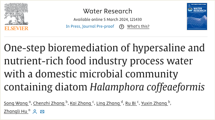 2024年3月5日,芒果体育生命与海洋科学学院胡章立教授团队在环境领域国际顶级期刊《Water Research》(影响因子:12.8)上发表题为“One-step bioremediation of hypersaline and nutrient-rich food industry process water with a domestic microbial community containing diatom Halamphora coffeaeformis”的研究论文。