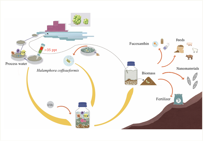 由于榨菜加工废水具有高盐度(大于3.5%)、低pH和丰富的营养盐等特点,因此榨菜加工废水的有效处理目前面临处理成本高、能耗大且处理过程中需要使用大量的化学试剂等困难,处理不当还会造成严重的环境危害。胡章立教授团队利用在污水中分离的一株硅藻—海生双眉藻(Halamphora coffeaeformis)和其共生细菌构建的微生物群落,成功实现了对高盐度和富营养化榨菜生产加工废水的“一步”处理。处理效果具体表现在该生物群落对无机和有机营养盐的高回收效率:微生物群落成功地从废水培养基中回收了91%的NH4+-N、78%的总氮、95%的总磷和82%的总有机碳。经过处理14天,除草酸外,所有鉴定的有机酸和氨基酸均被完全去除。废水中微生物群落生物量浓度达到1.74 g L-1,显著高于对照组(10倍f 2-1培养基)。由于收获的生物量中含有高价值的岩藻黄素(3 mg g-1),同时回收了大量磷元素,因此收获的生物量既可以用来生产高价值的生物活性物质还可以作为肥料或饲料进行增值化应用。