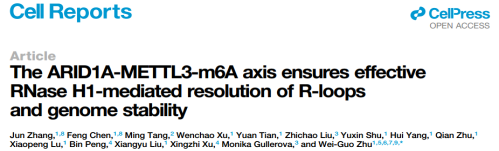 2024年2月,医学部卡尔森国际肿瘤中心朱卫国特聘教授团队在《Cell Reports》杂志上发表题为“The ARID1A-METTL3-m6A axis ensures effective RNase H1-mediated resolution of R-loops and genome stability”的研究论文,揭示了R-loop中RNA发生的m6A甲基化修饰对于RNase H识别R-loop并驱动R-Loop清除起到十分关键的作用。医学部助理教授张俊,研究生陈凤为本研究共同第一作者,朱卫国特聘教授为通讯作者。