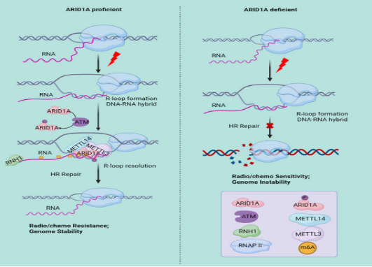 本研究首先证实了RNase H1RNase H1更倾向结合带有m6A甲基化修饰的R-Loop,并推动R-Loop的分解以促进DSB的DNA末端切除,从而确保基因组的稳定性。机制上,该团队鉴定出ARID1A在响应DNA损伤应激时快速识别R-Loop并进一步招募RNA甲基转移酶METTL3/14,从而驱动R-LoopRNA发生m6A修饰。功能研究显示ARID1A及METTL3的缺失会导致R-Loop积累,同时ARID1A-METTL3信号轴缺陷的细胞对基因毒性疗法更加敏感。鉴于异常表达的ARID1A与肿瘤患者对基因毒性疗法的耐药性有关,这些发现为探索针对ARID1A异常表达癌症的治疗提供了潜在新策略(具体工作模式图如下)。