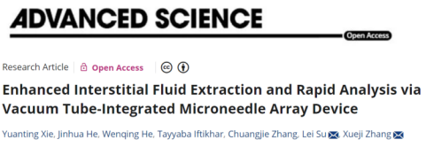 近日,芒果体育医学部生物医学工程学院张学记教授、苏磊教授团队在Wiley期刊Advanced Science(影响因子15.1,中科院一区,TOP期刊)上发表了题为“Enhanced Interstitial Fluid Extraction and Rapid Analysis via Vacuum Tube-Integrated Microneedle Array Device”的研究论文。医学部博士后谢媛婷为第一作者,张学记教授、苏磊教授为共同通讯作者,芒果体育为第一作者单位和通讯单位。