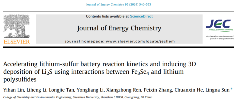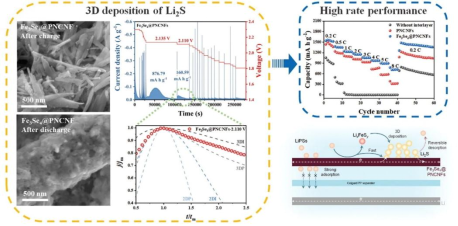 为解决锂硫电池硫正极的电导率差、穿梭效应、Li2S不可逆沉积和锂枝晶等问题,孙灵娜教授团队通过静电纺丝技术制备了Fe3Se4和多孔氮掺杂纳米纤维的复合材料(Fe3Se4@PNCNFs),并将其作为锂硫电池中间层来改善其电化学性能。研究表明Fe3Se4@PNCNFs对锂硫电池充放电过程中产生的多硫化锂中间产物有着较强的吸附和催化作用,能将多硫化锂保留在正极侧从而减弱穿梭效应。除此之外,在锂硫电池充放电过程中,Fe3Se4会与多硫化锂反应生成络合物LixFeSy,其能促进Li2S的三维沉积来增强其可逆能力和倍率性能,这为锂硫电池的性能改进提供了一条新的路径和策略。该论文《Accelerating lithium-sulfur battery reaction kinetics and inducing 3D deposition of Li2S using interactions between Fe3Se4and lithium polysulfides》发表在《Journal of Energy Chemistry》(影响因子13.1,中科院JCR 1 区),芒果体育化学与环境工程学院硕士研究生林一涵为第一作者,孙灵娜教授为通讯作者,芒果体育化学与环境工程学院为通讯单位。