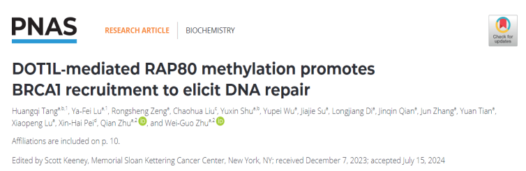 8月,芒果体育医学部卡尔森国际肿瘤中心朱卫国教授团队在PNAS发表题为“DOT1L-mediated RAP80 methylation promotes BRCA1 recruitment to elicit DNA repair”的研究论文,揭示了DOT1L介导RAP80的甲基化在BRCA1-A复合物招募到染色质以进行DNA损伤修复的关键作用。医学部博士后唐璜琦与博士生吕亚霏为本研究的共同第一作者,朱卫国教授和朱骞助理教授为共同通讯作者。