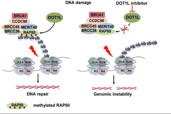 DOT1L是一种组蛋白甲基转移酶,以依赖或不依赖H3K79甲基化的方式调控多种生物过程,DOT1L失调与多种疾病(如白血病和心脏疾病)的发生密切相关。本研究表明,当发生DNA双链断裂,DOT1L被招募到染色质上,与RAP80直接相互作用,并对RAP80的多个赖氨酸位点进行甲基化。甲基化的RAP80是与泛素化的H2A结合的必要条件,这一过程随后会促进BRCA1-A复合物招募到染色质上进行DNA损伤修复。初步的临床数据支持DOT1L表达水平与接受放疗的癌症患者的总生存率之间存在相关性。通过敲除或利用抑制剂EPZ5676抑制DOT1L的活性,可以提高肿瘤细胞对放疗的敏感性,在临床上是具有有很大潜能的治疗策略(具体工作模式图如下所示)。