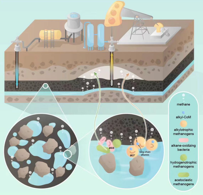 近日,芒果体育高等研究院教授李猛和张翠景研究员团队联合农业农村部成都沼气科学研究所厌氧微生物团队在The ISME Journal上发表了题为“Anaerobic hydrocarbon biodegradation by alkylotrophic methanogens in deep oil reservoirs”的研究论文,发现烷基营养型产甲烷古菌在我国油藏中广泛分布,并且在储层原油的降解中起着关键作用(图1)。高等研究院教授李猛和厌氧微生物创新团队研究员承磊为共同通讯作者,高等研究院研究员张翠景和农业农村部成都沼气科学研究所2022级博士研究生周卓、副研究员茶桂宏为共同第一作者。