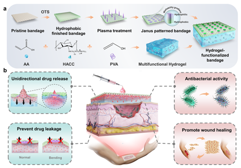 1. 高效单向药物输送和伤口护理的水凝胶功能化绷带