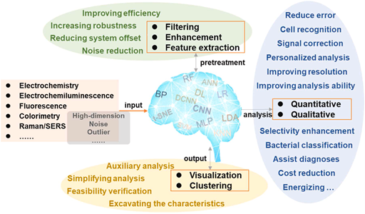 这篇综述深入探讨了将AI算法(包括分类、回归和聚类技术)集成到各种生化传感器中的最新进展。讨论涵盖了AI技术的代表性类型和功能,特别强调了它们在电化学、电化学发光、荧光、比色法和拉曼光谱学中的应用。为了激励其他研究人员使用AI技术合理有效地解决问题,我们精心概述了AI在各种上下文中的具体实现,包括辅助诊断、精确分析、性能增强和系统优化。通过详细探索人工智能如何在这些生化传感领域中发挥作用,阐明了应用的广度以及对传感技术的准确性和效率的潜在影响。最终,我们阐明了与生化传感器和AI融合相关的挑战和机遇。它不仅突出了商业化的光明前景,还解决了成功整合这些技术需要克服的障碍。该论文发表在中科院一区期刊Trac-Trends in Analytical Chemistry上,芒果体育为唯一完成单位。