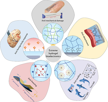 图9.极端水凝胶生物电子学,包括抗机械损伤,抗肿胀,防冻等水凝胶生物电子学