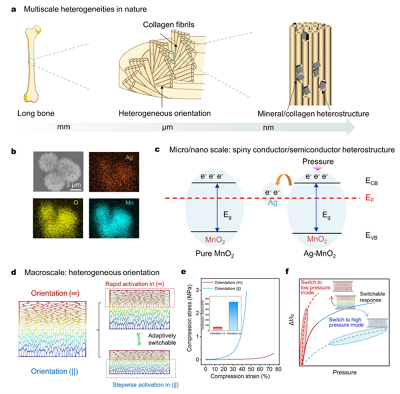 提出了一种基于多尺度异质性(微/纳米级异质结构和宏观异质细胞骨架)的压阻接口,可以动态适应特定的压力传感要求。多刺Ag-MnO2压阻微粒中的微纳米级异质结构能够实现较低的检测限制(0.008 Pa),并在高预载下高分辨率(0.0083%)的感知较小的压力增量。此外,具有异质取向的细胞骨架能够实现各向异性变形,即在低压下快速变形和在高压下逐步释放。与具有同质或单尺度异质接口的传感器相比,这种异质方向的设计提供了可切换的灵敏度和工作范围,能够区分复杂的压力源。该论文发表在自然指数期刊ACS Nano上,芒果体育为第一完成单位。