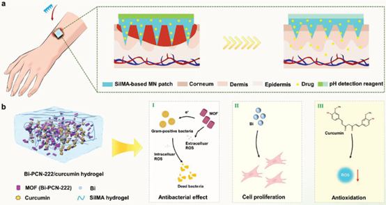 2. 支持伤口pH值视觉监测的自消毒微针传感贴片