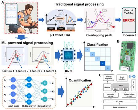 图5.机器学习驱动的可穿戴传感器用于区分汗液成分和预测疾病的示意图