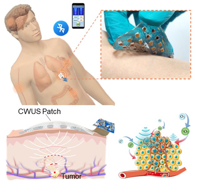 图7.可连续声动力治疗的全集成适形可穿戴超声系统及抗肿瘤治疗示意图