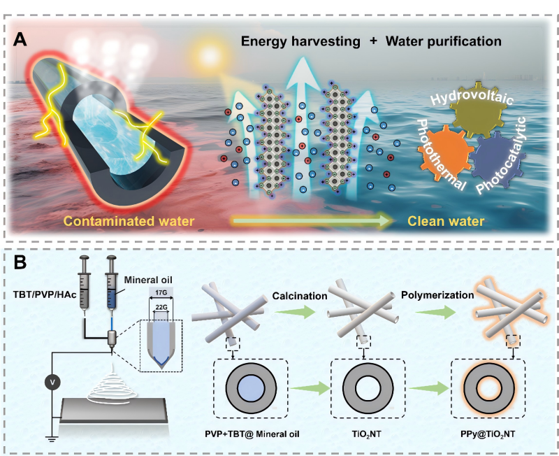 成果三:针对海洋开发中淡水和能源联合生产的需求,以及现有体系缺乏协同耦合机制以达到高效水电联产的现状,我们开发了一种基于聚吡咯包覆二氧化钛纳米管(PPy@TiO2NTs)的材料集成系统,该系统旨在实现太阳能驱动的电力和清洁水的联合生产,主要工作原理包括通过水伏发电效应进行电力生产,以及通过光热蒸发和光催化的双重机制来生产清洁水PPy@TiO2NTs的中空纤维结构显著增加了水流与材料界面的接触面积,并提升了流速,从而产生了更多的双电层(EDL),同时延缓了热量散失,并提供了丰富的催化活性位点。另一方面, PPy@TiO2NT界面强大的分子相互作用以及吸附性和极性的提升也促进了电荷的有效转移。因此,PPy@TiO2NT体系展现出了卓越的水伏发电和净水生产性能。