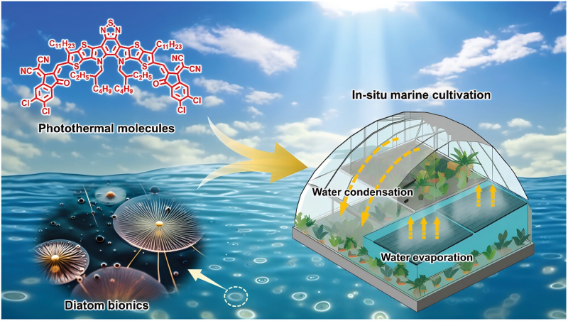 成果四:在全球人口快速增长和经济持续发展的背景下,耕地和淡水资源的短缺已经成为我们生活中日益严重的问题。太阳能驱动的界面水蒸发技术,利用太阳能界面集热的方式实现海水淡化,是最有希望获得高质量淡水的方法之一。近年来,科研人员在光热材料设计合成、太阳能蒸发器结构调控方面展开研究,不断提高蒸发器的蒸发速率和太阳能-蒸汽转换效率。其中,基于有机分子的光热蒸发体系以其质轻、低廉及结构可调等特点受到关注,然而在面向实际应用中面临着捕光效率低、循环性能差、易氧化失效等问题。基于此,我们提出了利用仿生界面的独特结构和润湿性配合有机共轭分子,实现高效捕光和循环稳定的光热海水淡化策略,研究结果为低成本、制备简易、抗盐耐用的太阳能蒸发系统和海上农业提供了新的思路。研究人员受水生硅藻的启发,通过简单的有机合成方法得到光热共轭分子,将光热分子负载到了低成本的木浆海绵纤维基材上,分别构建了具有水面下悬浮机制的蒸发器。在一个标准太阳光下,蒸发器的太阳能-蒸汽转换效率超过了88%,并且蒸发器的太阳能水蒸发效率最高达到1.62 kg m−2 h−1,这是目前基于纯有机分子蒸发器的最高效率之一。