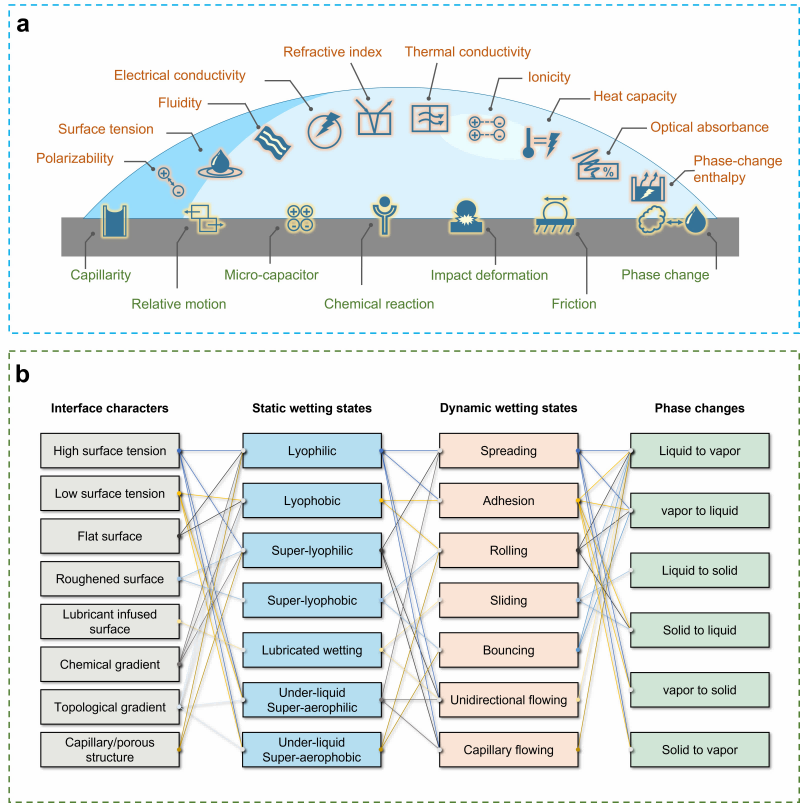 水-空气-固体界面作为自然界与工程技术中普遍存在的物理现象,其特性深刻影响着电、光、热等能量形式及信号在界面间的传输效率。这一界面不仅是能量与信号交互的桥梁,其性质更如同精密调控的阀门,对能量流与信号流的性质与行为产生深远影响。在理想状态下,能量与信号能够自发地穿越界面,如电荷沿电场梯度定向迁移、光线穿透透明介质、热量自然地从高温区域流向低温区域。然而,实际应用中,润湿界面往往成为制约能量与信号高效传输的瓶颈,具体表现为电流衰减、光线散射、热传导效率低下等现象。因此,对界面及其润湿性的精心设计显得尤为关键。这不仅是为了克服界面障碍,减少能量与信号的损失,更是为了实现对能量与信号传输过程的按需调控,以满足智能自适应设备对高效、精准能量管理的需求。通过调控界面的润湿性,能够精确控制界面上的能量与信号行为,为先进电子器件、光子元件及高效传热系统的设计与制造开辟新的途径,推动科技进步与产业升级。