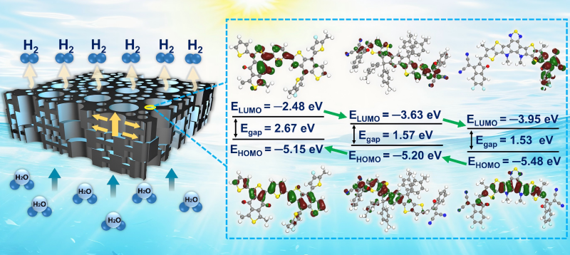 成果二:基于光敏材料分子尺度的梯度能级排列,并结合具有微纳米尺度的分级孔结构的超浸润木质纤维基底,构建了一种新型的多尺度层级结构的有机光催化制氢平台。与传统的给体-受体体系相比,该三元体系促进了电荷转移并增强了光催化活性。同时,该平台的润湿层级孔结构界面赋予了其反复捕获光能和在水面下自悬浮的能力,从而同时提高了光利用效率并减少了盐沉积,展现出良好的耐久性。在氙灯照射下,该有机催化平台在牺牲剂存在时的析氢速率达到165.8 mmol h−1m−2,超过了大多数报道的无机系统。在构建的可规模化系统上(1600 cm2),该平台在连续五小时的日照内(正午时段)从海水中产生了80.6 ml m−2的氢气。更重要的是,这种跨学科的创新方法,涵盖了分子和微纳结构两个层面,为光催化制氢向真正应用导向型发展提供了方向。