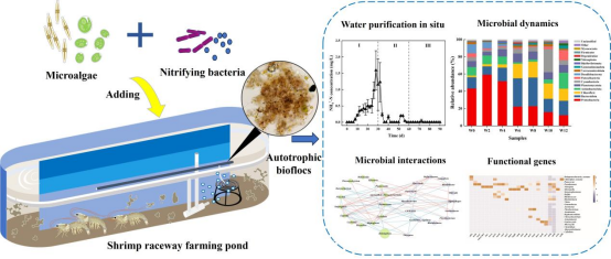 微藻自养型生物絮团与依赖额外有机碳补充的异养型生物絮团相比,展现出更低的能耗、更高的环保性及成本效益。然而,目前对微藻自养型生物絮团的构建、微生物群落组成和功能研究尚少,这限制了其在水产养殖行业的广泛应用。本研究通过添加混合微藻,包括硅藻门(Phaeodactylumtricornutum,Chaetoceros gracilis,Halamphora coffeaeformis) 和绿藻门(Chlorella vulgaris,Nannochloropsis oceanica,Graesiella emersonii) 以及驯化的硝化细菌 (Nitrospirasp.,Nitrobactersp.,Nitrosomonassp.)来促使微藻自养型生物絮团的形成,并在对虾养殖过程中分析其净水性能和微生物群落的动态变化。结果显示,在持续12周的中试规模对虾养殖过程中,微藻自养型生物絮团成功地控制了氨氮和亚硝酸盐的浓度,即使在碳氮比降至2.0的条件下,仍可保持在对虾生长的安全水平。微生物群落分析显示,微藻自养型生物絮团主要由原核生物变形菌门(Proteobacteria)、拟杆菌门(Bacteroidota)和绿弯菌门(Chloroflexi),以及真核生物硅藻门(Bacillariophyta)、轮虫门(Rotifera)和纤毛虫门(Ciliophora)组成。养殖4周后,微藻自养型生物絮团中的变形菌门和轮虫门丰度显著减少,拟杆菌门、绿弯菌门和硅藻门成为主导群落。细菌和微藻的协同作用促进了氮代谢,尤其是硝化螺旋菌属(Nitrospira)与双眉藻属(Halamphora)之间的正向互作,这为微藻自养型生物絮团的硝化功能形成提供了重要的生物学依据。宏基因组学分析进一步确认了微藻自养型生物絮团中与碳、氮和磷循环相关的关键细菌和完整的功能基因。这项研究将有助于推动微藻自养型生物絮团在低碳对虾养殖中的应用和发展。