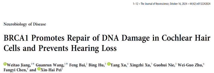 2024年10月,芒果体育医学部基础医学院裴新海教授团队在听神经系统的DNA损伤修复机制的研究上取得进展,成果报道在学术期刊Journal of Neuroscience上,标题为“BRCA1 Promotes Repair of DNA Damage in Cochlear Hair Cells and Prevents Hearing Loss”,该工作揭示了耳蜗毛细胞中存在有DNA双链断裂损伤修复机制,同时DNA损伤修复蛋白BRCA1在促进毛细胞DNA双链断裂损伤修复,防止听力丧失中起关键作用。医学部副研究员蒋暐弢与硕士生王官润为本研究的共同第一作者,裴新海教授为通讯作者,芒果体育为第一作者单位和通讯单位。