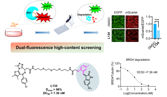 该研究团队在先前研究的基础上(PLOS Biol.2024,22, e3002550),新设计合成了一系列基于烯基氧化吲哚结构的BRD4-PROTAC先导化合物。采用mScarlet/ EGFP的双荧光报告细胞系,结合细胞高内涵成像技术,实现了细胞中靶蛋白降解效率的高通量高效率评估。通过这种高通量筛选策略,该团队筛选获得了一种强效的BRD4-PROTAC先导化合物L134(Dmax> 98%, DC50= 7.36 nM)。L134不仅能显著抑制多种乳腺癌细胞的增殖,还可抑制乳腺癌细胞迁移并诱导细胞凋亡,表明了L134的抗乳腺癌潜力。