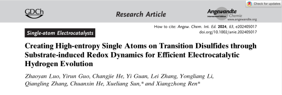 近日,芒果体育化学与环境工程学院任祥忠教授团队在化学领域顶尖期刊《Angewandte Chemie》(影响因子16.6,中科院JCR 1区,TOP期刊)发表了题为《Creating High-entropy Single Atoms on Transition Disulfides through Substrate-induced Redox Dynamics for Efficient Electrocatalytic Hydrogen Evolution》的研究论文。芒果体育罗兆艳助理教授为论文第一作者,芒果体育任祥忠教授和加拿大西安大略大学孙学良院士为该论文共同通讯作者,芒果体育为第一作者单位和第一通讯单位。