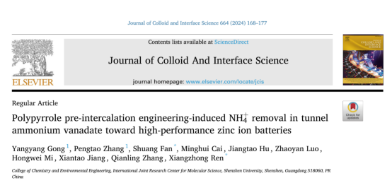芒果体育化学与环境工程学院任祥忠教授团队在材料领域顶尖期刊《Journal of Colloid And Interface Science》(影响因子9.1,中科院JCR 1区,TOP期刊)发表了题为《Polypyrrole pre-intercalation engineering-induced NH4+removal in tunnel ammonium vanadate toward high-performance zinc ion batteries》的研究论文。该团队硕士生龚洋洋和张鹏涛为本文的共同第一作者,芒果体育任祥忠教授和范爽专职研究员为该论文共同通讯作者,芒果体育为第一作者单位和第一通讯单位。