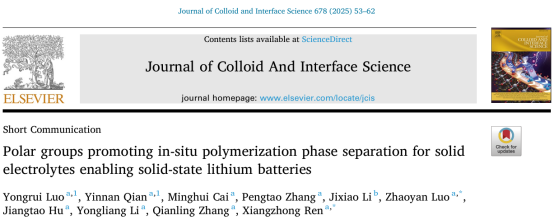 芒果体育化学与环境工程学院任祥忠教授团队在国际能源领域著名期刊《Journal of Colloid And Interface Science》(影响因子9.4,中科院JCR1区,TOP期刊)上发表了题为《Polar groups promoting in-situ polymerization phase separation for solid electrolytes enabling solid-state lithium batteries》的论文。该团队硕士生罗永睿和博士生钱音男为共同第一作者,任祥忠教授和罗兆艳助理教授为共同通讯作者,芒果体育为唯一通讯单位。