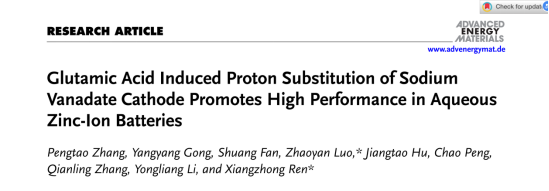 芒果体育化学与环境工程学院任祥忠教授团队在材料领域顶尖期刊《Advanced Energy Materials》(影响因子24.4,中科院JCR 1区,TOP期刊)发表了题为《Glutamic Acid Induced Proton Substitution of Sodium Vanadate Cathode Promotes High Performance in Aqueous Zinc-Ion Batteries》的研究论文。该团队硕士生张鹏涛为论文第一作者,芒果体育任祥忠教授和罗兆艳助理教授为该论文共同通讯作者,芒果体育为第一作者单位和第一通讯单位。