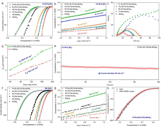 在本研究中,作者通过一种衬底介导的SAs形成策略,成功地在MoS2和MoSe2载体上制备了多金属SAs和HESAs的文库,可以精确地控制SAS的掺杂位置。特别是,SAs的含量可以不断增加,直到TMDS载体上可达的Mo原子完全被SAs取代,从而允许更高的金属含量。深入的机理研究表明,通过控制TMDS/TM离子界面上发生的可逆氧化还原反应,实现了多金属SAS和HESA的良好控制合成。作为概念验证的应用,各种SAs-TMDs被应用于析氢反应。优化的HESA-TMDs(Pt、Ru、Rh、Pd、Re-MoSe2)比最先进的铂具有更高的活性和耐用性。因此,本研究工作将拓宽单原子催化剂的家族,为合理设计高性能的单原子催化剂提供新的指导。